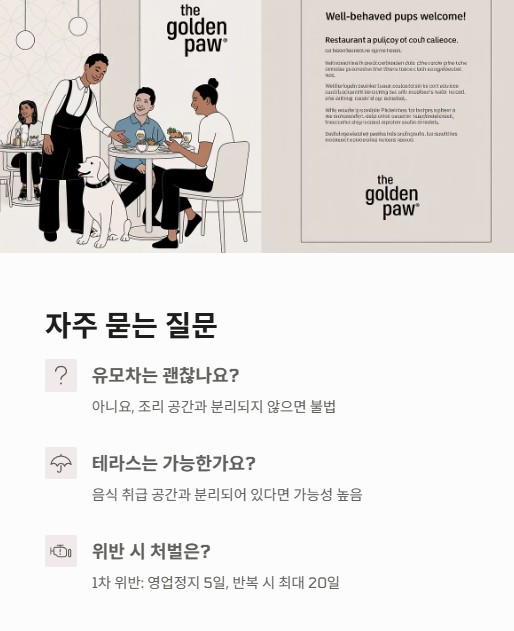 식품위생법에 따라 일반 식당에 반려견을 동반하는 건 원칙적으로 금지됩니다. 하지만 일정 기준을 충족하면 예외적으로 허용됩니다. 식당 반려견 동반 출입이 가능한 조건, 합법 운영 방법, 자주 묻는 질문까지 한눈에 정리해드립니다.